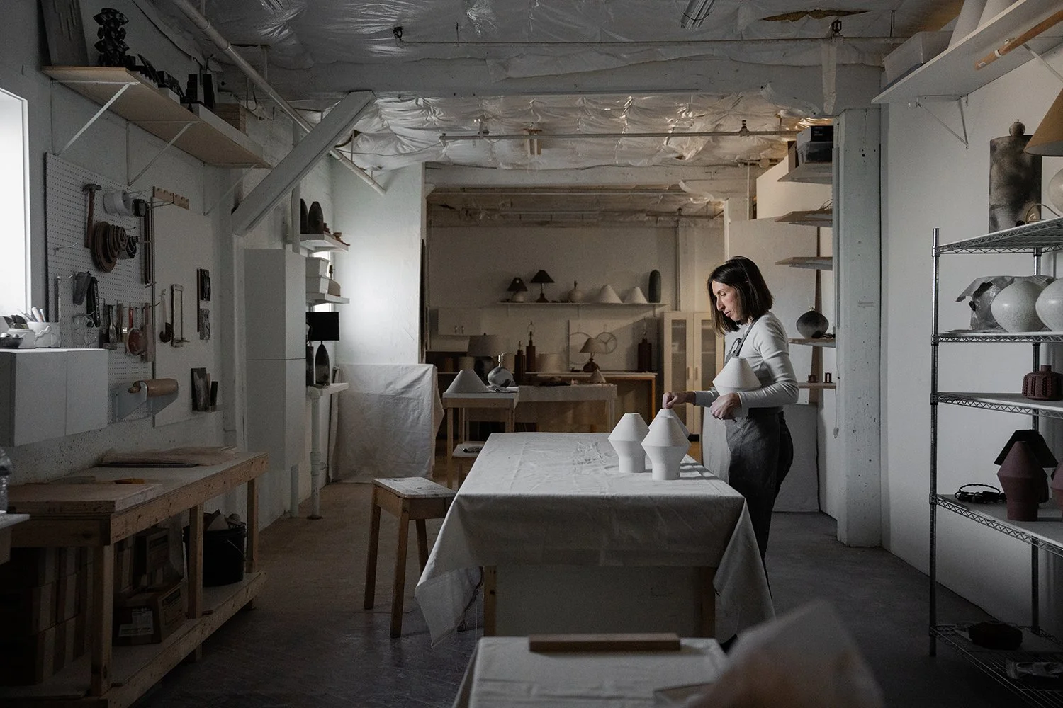 With over 15 years in the field of ceramics, her daily practice is rooted in the joy of making. She refines surfaces and builds dynamic forms with wet clay, bringing each piece into being with deliberate care and precision. From her studio in Sheboygan, Wisconsin, Emily brings lighting to life for designers and clients alike, enhancing interiors with handcrafted pieces that radiate warmth and texture.